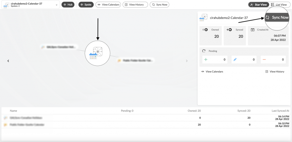 11. Im CiraHub Dashboard, klicken Sie auf den Hub, dann klicken Sie auf Jetzt synchronisieren.