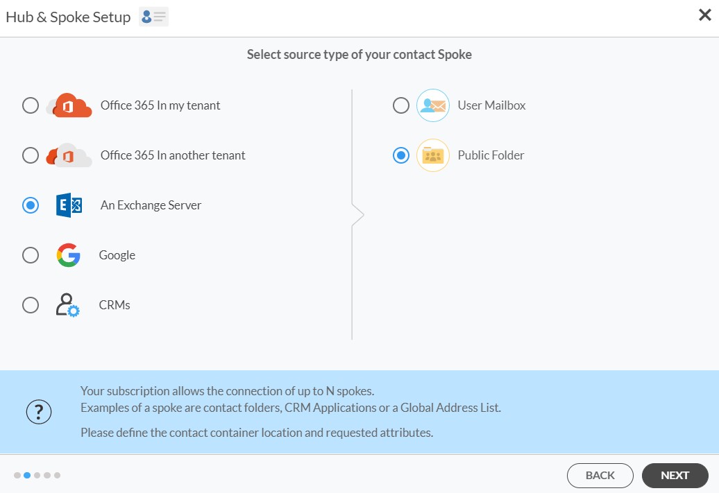 - Ensuite, commencez la configuration Hub and Spoke. Cliquez sur « Exchange Server » comme type de source pour votre spoke de contacts et sélectionnez Public Folder.