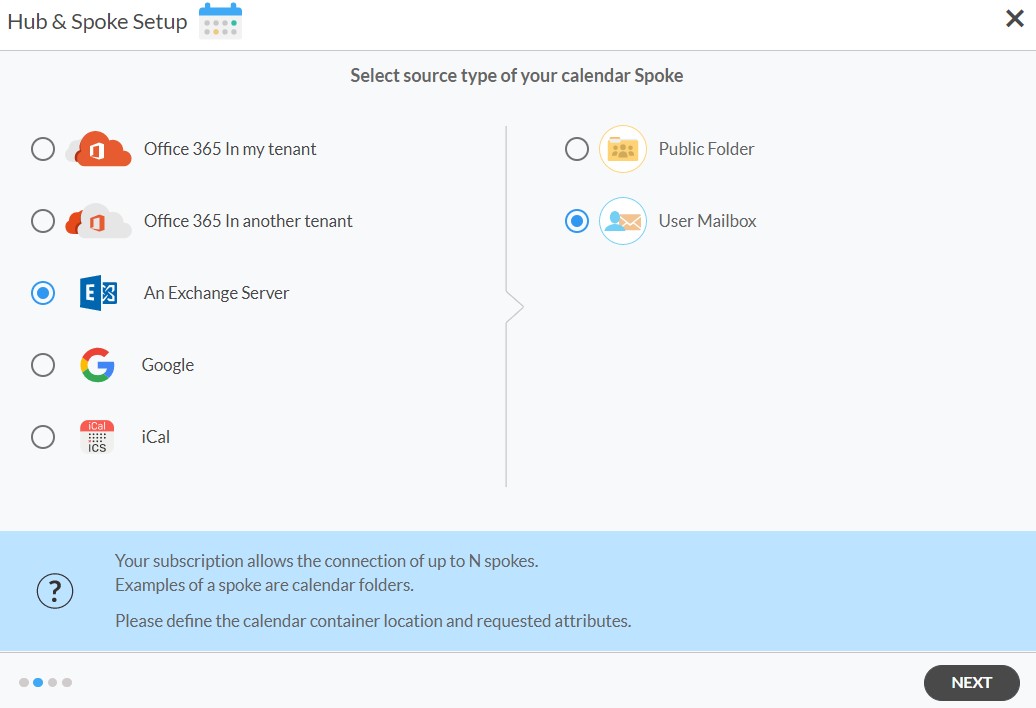 6. Démarrez ensuite la configuration Hub and Spoke. Cliquez sur « Exchange Server » comme type de source pour le Spoke de votre calendrier et sélectionnez User Mailbox.