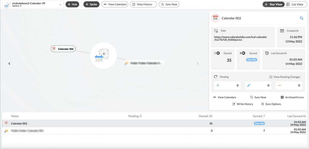 9. Sur le tableau de bord de CiraHub, cliquez sur le Hub, puis cliquez sur Sync Now pour activer la synchronisation du calendrier entre un dossier public Exchange Server et iCal. (Voir l’image ci-dessous.)